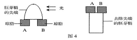 3、选择题 图4左侧表示对燕麦胚芽鞘尖端所做的处理,一段时间后,将琼脂块A、B放在去除尖端的胚芽鞘上,该胚芽鞘的生长情况是