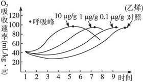 ①随着乙烯浓度增大,呼吸峰出现的时间提前②随着乙烯浓度增大,呼吸峰的强度不变③乙烯影响达到呼吸峰的时间长短④乙烯是通过影响酶的活性来影响呼吸速率的