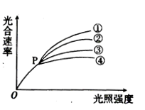 1、选择题 在四种不同的实验条件下(①0.1%CO2、30℃,②0.1%CO2、20℃,③0.03%CO2、30℃,④0.03%CO2、20℃),测定光照强度对光合速率的影响。图中曲线分别表示了①—④实验的结果。下列对于限制光合作用速率主要因素的判断,正确的一组是?