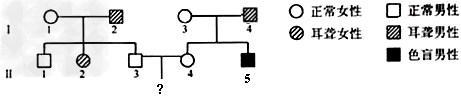 1、选择题 已知人的红绿色盲属X染色体隐性遗传,先天性耳聋是常染色体隐性遗传(D对d完全显性)。下图中Ⅱ2为色觉正常的耳聋患者,Ⅱ5为听觉正常的色盲患者。Ⅱ4和Ⅱ3婚后生下一个孩子,这个孩子只患一种病的可能性是