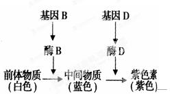1、选择题 香豌豆能利用体内的前体物质经过一系列代谢活动逐步合成中间产物和紫色素,此过程是由B、b和D、d两对等位基因控制(如下图所示),两对基因不在同一对染色体上。其中具有紫色素的植株开紫花,只具有蓝色中间产 物的开蓝花,两者都没有的则开白花。下列叙述中不正确的是