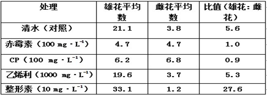 1、选择题 丝瓜为异花传粉植物,将刚开始萌发的该植物种子先在下表5种一定浓度的溶液中浸泡24 h,然后种植。比较植株上雌花与雄花的平均数,求出性别比,实验观察结果如下表所示: