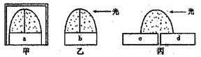 5¡¢Ñ¡ÔñÌâ ʵÑéÖ¤Ã÷£¬¹âÕÕ¿ÉÒÔÓ°ÏìÉú³¤Ëصķֲ¼£¬¶ø²»»áʹÉú³¤Ëطֽ⡣ÏÖÇÐÈ¡¼×¡¢ÒÒ¡¢±ûÈý¸öÏàͬ´óСÇÒÉú³¤×´¿öÏàËÆµÄÅßÑ¿Çʼâ¶Ë£¬ÆäÖмס¢ÒÒ×ÝÏò²åÈ벻͸ˮµÄÔÆÄ¸Æ¬£¬½«ÈýÕß·Ö±ðÖÃÓÚa¡¢b¡¢c¡¢dËĸöÇíÖ¬¿éÉÏ£¨ÈçͼËùʾ£¬c¡¢dÁ½ÇíÖ¬¿é²»½Ó´¥£©¡£È»ºó½«¼××°Ö÷Žø²»Í¸¹âµÄ°µºÐÖУ¬ÒÒ¡¢±û×°ÖøøÓèÓҲ൥Ïò¹âÕÕÉä¡£¾¹ýÒ»¶Îʱ¼äºó£¬²â¶¨ÇíÖ¬¿éÖÐÉú³¤Ëصĺ¬Á¿Îª