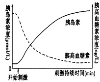 2、综合题 实验:选取健康大鼠,持续电刺激支配其胰岛的副交感神经,测定血液中胰岛素和胰高血糖素的浓度,结果如下图。