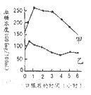 5、选择题 正常人空腹时,100mL血液中含葡萄糖约80~120mg。甲、乙两人分别口服100g葡萄糖液后,连续测其血糖浓度的变化如右图。下列有关叙述最合理的是