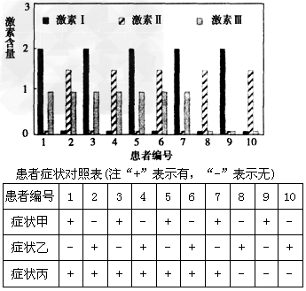 3、选择题 下列柱状图和表格分别表示十位患者血液样本中三种激素Ⅰ、Ⅱ、Ⅲ的相对含量以及与症状甲、乙、丙的对应关系。下列有关分析正确的是