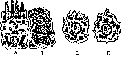 3、选择题 下图中A、B是呼吸道管壁上分布最多的两种细胞结构示意图,当灰尘、病菌等异物进入时,呼吸道可将包裹异物的黏液推向喉部,通过咳嗽将痰排出体外。C、D细胞位于A、B底部,无突出特征,且可形成A、B细胞。有关叙述错误的是