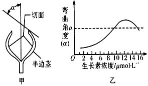 (1)从图乙可知,在两个不同浓度的生长素溶液中,茎段半边茎生长产生的弯曲角度可以相同,请根据生长素作用的特性,解释产生这种结果的原因是_____________________________________________。