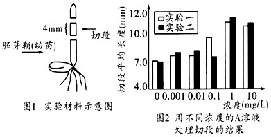 1、选择题 为验证生长素类似物A对小麦胚芽鞘(幼苗)伸长的影响,将如图1所示取得的切段浸入蒸馏水中1小时后再分别转入5种浓度的A溶液(实验组)和含糖的磷酸盐缓冲溶液(对照组)中。在23℃的条件下,避光振荡培养24小时后,逐一测量切段长度(取每组平均值),实验进行两次,结果见图2。以下分析错误的是