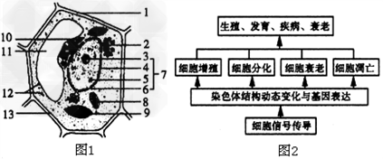 (2)如果图1为根尖分生区的细胞,不应具有的结构是[? ]_______、[? ]_______。在有丝分裂间期,主要的物质变化是______;在有丝分裂末期,[2]与______的形成有关。
