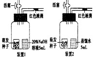 5、选择题 在外界环境条件恒定时,用右图装置测定种子萌发时的细胞呼吸类型(假设呼吸底物全部为葡萄糖),实验开始同时关闭两装置活塞在25℃下经过20min后观察红色液滴的移动情况,下列对实验结果的分析错误的是