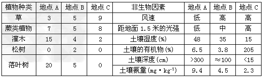 2、连线题 某研究小组的同学利用样方法研究野山坡上A、B、C三个不同地点的植物群落,同时还测量了各种土壤特征和环境因素,结果见下表。根据所得数据回答问题: