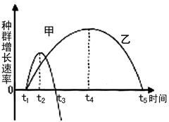 2、选择题  如图表示一个生物群落中甲、乙两个种群的增长速率随时间变化的曲线,下列叙述错误的是