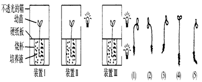 4、选择题 某小组研究光对同一种植物幼苗生长的影响,设计的实验装置如左下图。某同学预测幼苗几天后的生长可能情况如右下图。请你判断:几天后,实验装置Ⅰ~Ⅲ中幼苗的正确形态依次是