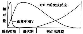 5、选择题 下图为HIV造成艾滋病的过程,显示人体内产生免疫力与HIV出现的情况。此外在临床上,初期与潜伏期时并无病症出现。在潜伏期时要如何采样与检测,以判断病人是否已被感染艾滋病