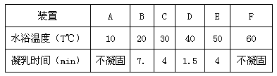 通过多次实验,并记录不同温度下凝乳所需要的时间,结果如下表: