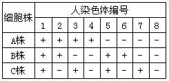 (3)将分离出的杂种细胞在不同条件下继续培养,获得A、B、C三种细胞株。各细胞株内含有的人染色体如下表(“+”表示有,“-”表示无),测定各细胞株中人体所具有的五种酶的活性。结果是: