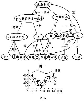 1、连线题 图一是关于生态系统成分的概念图(部分),①~⑦表示有关连线的序号,箭头⑦的意义是“C是生态系统的基石”。图二为一定时间内森林生态系统中几个种群数量变化曲线。请据图分析回答: