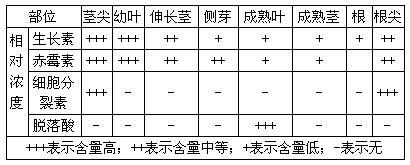 5、综合题 植物生命活动调节的基本形式是激素调节,下面是有关植物激素的知识及实验研究,请根据有关信息分别回答下列问题。植物激素对植物的生长发育具有显著调节作用,植物的生长发育是由多种激素相互协调、共同调节的,下表是植物不同部位各种激素的相对浓度,请分析后回答: