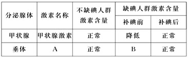 4、填空题 下表是缺碘与不缺碘的两类人群中,血液内与甲状腺活动密切相关的两种激素含量状况。