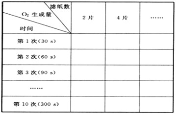 4、综合题 下图为测量过氧化氢酶与过氧化氢反应放出O2的实验装置,水槽内注有清水,倒置的量筒内也充满了清水。提前制作大小相同的圆形小滤纸片若干。