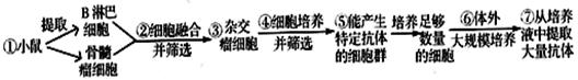 本题解析:试题分析:单克隆抗体:由单个B淋巴细胞进行无性繁殖形成的细胞系所产生出的化学性质单一、特异性强的抗体。从图中分析可知,④中的筛选是为了获得能产生特定的抗体而不是多种抗体的杂交瘤细胞。故C不正确。