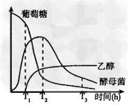 1、选择题 下图为不同培养阶段酵母菌种群数量、葡萄糖浓度和乙醇浓度的变化曲线,下列分析错误的是