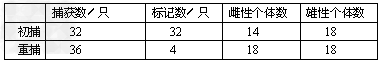 1、填空题 “标志(记)重捕法”是动物种群密度调查中的一种常用取样调查法:在被调查种群的生存环境中,捕获一部分个体(M)全部进行标记后释放,经过一段时间后进行重捕,根据重捕中标记个体数(m)占总捕获数(n)的比例,估计该种群的数量(N)。某研究机构对我国北方草原一种主要害鼠——布氏田鼠进行了调查。调查样方总面积为2hm。(1hm=10000m2) ,随机布设100个鼠笼,放置1夜后,统计所捕获的鼠数量、性别等,进行标记后放归;3日后进行重捕与调查。所得到的调查数据如下表。