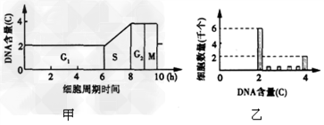 3、选择题 图甲为小鼠膀胱癌细胞的一个细胞周期(G1、S、G2组成了分裂间期,M为分裂期)中细胞核内DNA含量的变化曲线,图乙表示一个细胞周期中某组织处于不同分裂时期的细胞数目情况( 用特殊方法在一个培养基中测得的)。下列分析不正确的是