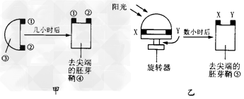 1、选择题 用燕麦幼苗做如下图所示的两组实验。甲组:将切下的胚芽鞘尖端③水平放置,分别取两个琼脂块①、②紧贴在③的切面上,数小时后如甲图所示处理。乙组:将附有琼脂块X和Y的胚芽鞘顶端放在旋转器上匀速旋转,数小时后如乙图所示处理。以下说法错误的是