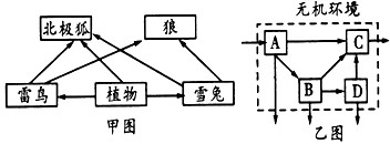 4、连线题 图甲为北极冻原生态系统中部分生物构成的食物网示意图。图乙虚线方框内表示一个生态系统中的生物群落,箭头表示该生态系统中物质和能量流动的方向。请据图回答下列问题: