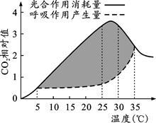 本题解析:试题分析:图示虚线和实线可分别表示光合速率和呼吸速率。此实验研究的是温度对某蔬菜新品种产量的影响,A错误。温度为25~30℃,净光合速率(净光合速率=总光合速率-呼吸速率)最大,积累有机物的量最多,B正确。由图可知,光合作用酶的最适温度为27℃左右,呼吸作用酶的最适温度高于35℃,C错误。阴影部分表示5~35℃时蔬菜的净光合速率大于零,积累了有机物,D错误。