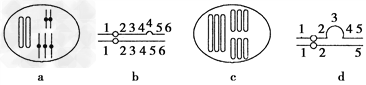 2、选择题 某些类型的染色体结构和数目的变异,可通过对细胞有丝分裂中期或减数第一次分裂时期的观察来识别。a、b、c、d为某些生物减数第一次分裂时期染色体变异的模式图,它们依次属于