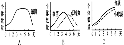 4、连线题 在1~5号5个三角瓶中分别加入某种培养液,把瓶口封闭后在高温下灭菌处理。冷却后,在l号瓶内放入草履虫,2号瓶内放入小球藻,3号瓶内放入某种细菌。结果1号、2号瓶内的草履虫与小球藻不能繁殖。3号瓶内的细菌个体数变化如图A所示。4号瓶内同时放入草履虫与细菌,两者个体数目变化如图B所示。5号瓶内同时放入等量的细菌和小球藻,两者个体数目变化如图C所示。以上实验是在25℃、光照充足条件下进行的。回答下列各问题: