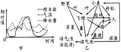(2)蝗虫体内蛋白质含量较高,可以作为优质蛋白食品的来源。在某地乡村,有人利用局部荒地与耕地结合建立起如乙图所示的养殖和生产模式。