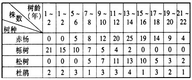 2、连线题  我国东南某山区于25年前发生森林火灾,焚毁所有林木。历经长期消长之后,某生态学者于今年在该地进行生态调查,得到结果如下表,表内数字为各树种不同年龄级的株数。试回答下列问题: