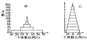 (3)调查甲、乙两草原所捕获鼠的月龄,它们的月龄构成如下图。据图分析:草原的田鼠种群属于___型;草原的田鼠种群属于____型,可以预测,该草原鼠害将很严重,必须做好防治准备工作。