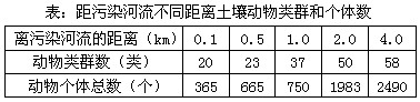1、填空题 某地曾是著名的鱼米之乡,植物生长茂盛,土壤动物种类繁多。后来,由于上游地区一农药厂的污染废水排入河流,造成该地农田土壤环境持续恶化,原本常见的泥鳅、田螺等几近销声匿迹。为了调查污染废水对农田土壤动物类群的影响,在受污染河流一侧不同距离进行调查,调查结果见表:
