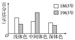4、选择题 科学家发现某地某种蝴蝶在1863年和1963年不同体色个体数量所占百分比如下图所示。下列叙述正确的是