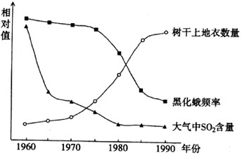 (2)①.由于煤烟排放量减少,SO2浓度逐年降低。②.由于SO2浓度降低,树干上地衣数量逐渐增多。原因是地衣对SO2敏感,因此SO2浓度降低,有利于地衣生长。③.由于地衣数量增多,黑化蛾频率逐年降低。原因是地衣颜色浅,黑化蛾易被鸟捕食。