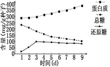 4、选择题 为了研究大豆种子萌发和生长过程中糖类与蛋白质的相互关系,某研究小组在25℃、黑暗、无菌、湿润的条件下进行实验,测定不同时间种子和幼苗中相关物质的含量,结果如图所示。下列叙述正确的是