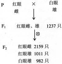 2、选择题 1909年,摩尔根从他们自己培养的红眼果蝇中发现了第一个白眼雄蝇。用它做了如右下图所示的实验(注:不同类型的配子及不同基因型的个体生活力均相同)。关于该实验的说法错误的是