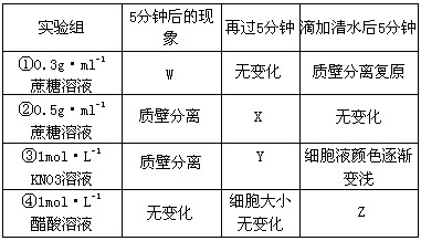 2、选择题 某同学在做“观察洋葱表皮细胞的质壁分离和复原”实验时,在老师的帮助下对本实验进行了一系列的创新改进。改进后的实验步骤与现象如下表,则对该表的推断或解释不正确的是