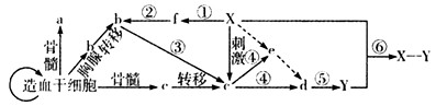 2、选择题 下图表示人体内某些淋巴细胞的分化和某种免疫过程,数字表示过程,字母表示细胞或物质。下列叙述正确的是