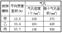 一项研究表明,植物对SO2的“抗性”与叶片上气孔密度和气孔大小等有关。所得数据如下表: