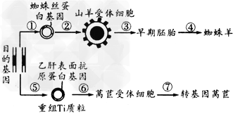 (2)过程②将重组质粒导入山羊受体细胞时,采用最多也最有效的方法是________。通过①-④过程培育的蜘蛛羊可以作为乳腺生物反应器,从________中提取所需要的蜘蛛丝蛋白。