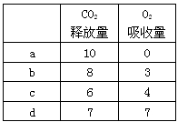 1、选择题 下在a、b、c、d条件下,测得某植物种子萌发时和体积变化的相对值如下表。若底物是葡萄糖,则下弄叙述中正确的是
