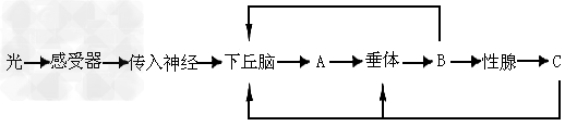 (2)上面图解中的A、B、C分别代表由下丘脑、垂体和性腺分泌的物质,则它们分别是________、_________和___________。C进入血液后,通过作用来调节下丘脑和垂体中激素的合成和分泌。