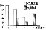4、选择题 在a、b、c、d四种不同条件下,测得某植物种子萌发时CO2和O2体积变化的相对值如下图。若底物是葡萄糖,则下列叙述中错误的是