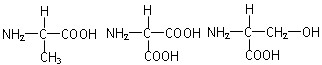 4、选择题 下面是3种氨基酸的结构式,由这3种氨基酸按顺序脱水缩合所形成的化合物中,含有的氨基、羧基和肽键的数目依次是